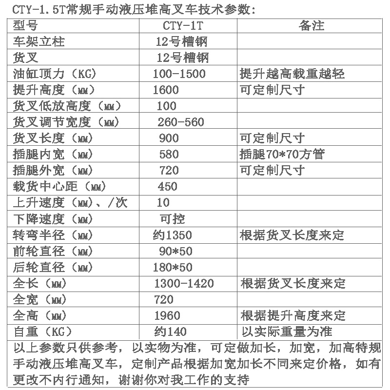 CTY型1.5吨手动液压堆高车 泰兴手推升降设备 装卸搬运堆垛叉车